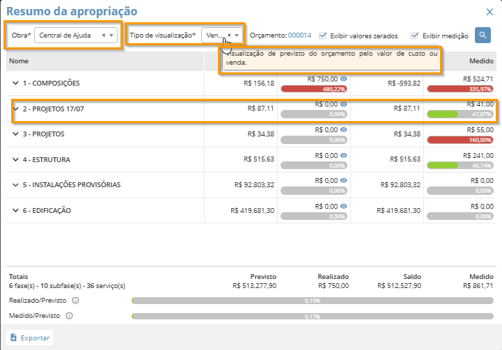 Dessa forma, será possível ver os dados resumidos da apropriação por fase e serviço específicos para aquela obra.