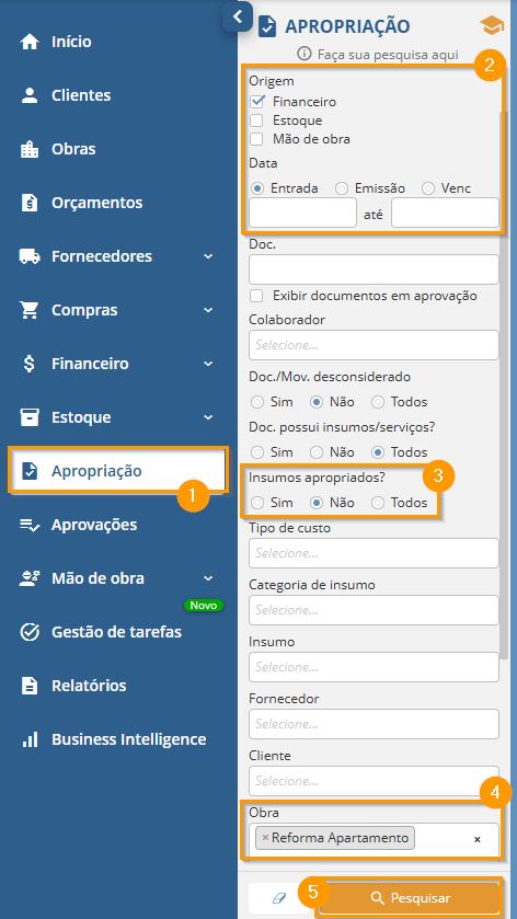 Acesse o módulo de “Apropriação”, defina a “Origem”, “Data”, “Obra” e filtre para insumos não apropriados.