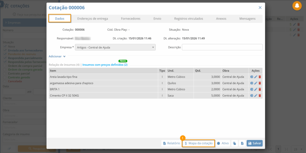 ⚠️ Atenção!! É importante destacar que o Mapa da Cotação fica disponível quando você adiciona os fornecedores à cotação. Essa etapa é fundamental para garantir que todas as informações sejam registradas e exibidas corretamente no mapa.