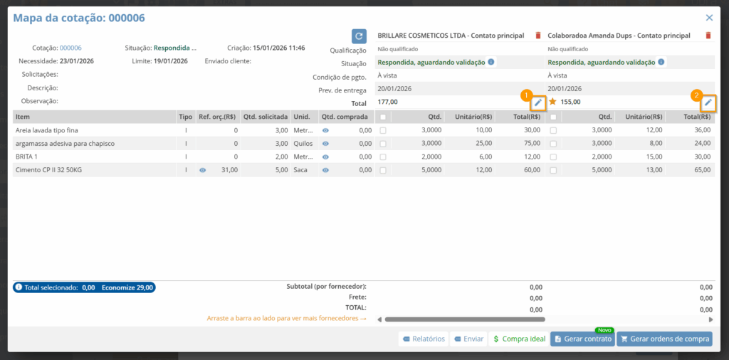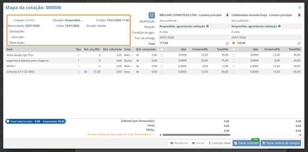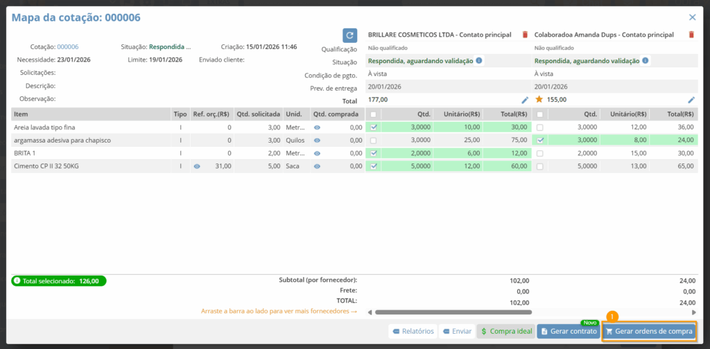 Você também pode usar a opção “Compra ideal“, que mostrará quais itens cada fornecedor cotou com o menor preço.