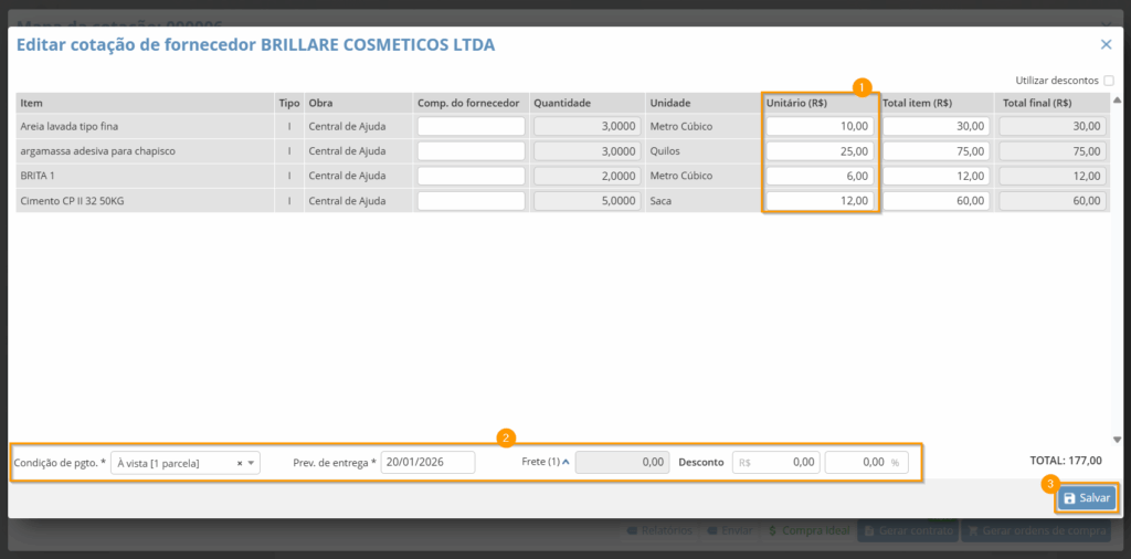 O sistema abrirá uma tela de edição da cotação e na coluna “Unitário (R$)” é onde você deve adicionar as informações dadas pelo Fornecedor.