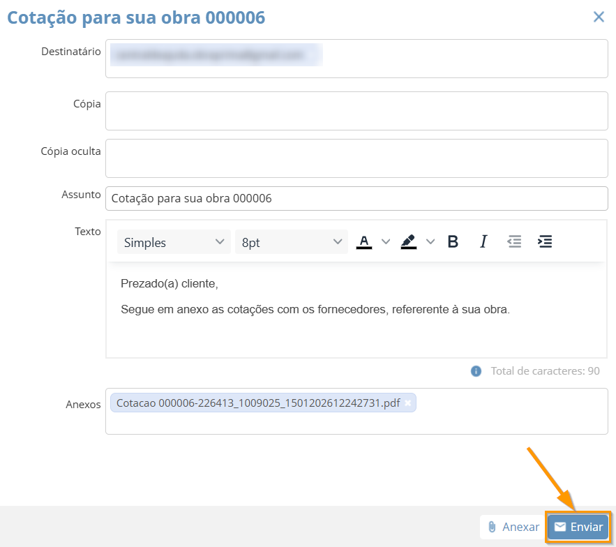 Após isso, uma nova aba irá sobrepor a atual para você definir alguns parâmetros de envio, como: Destinatário, Cópia, Cópia oculta, Assunto, Texto e Anexos.