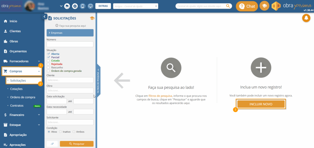 Acesse o módulo “Compras“, clique em “Solicitações“. Após isso, poderá clicar direto em “Incluir novo“.