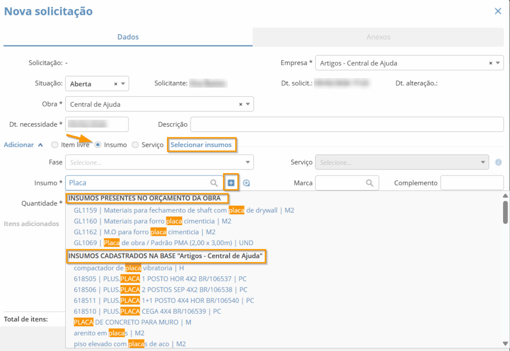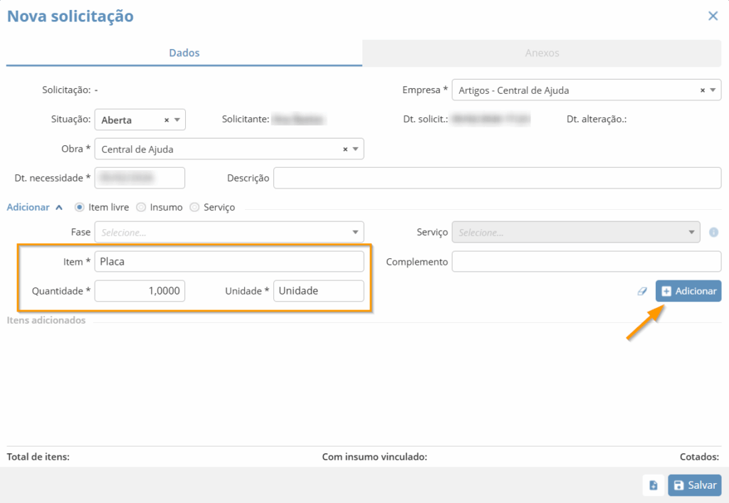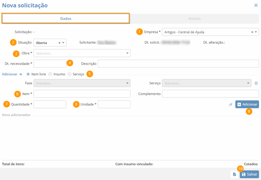 Na aba de “Dados“, você precisará definir a “Empresa“, se houver filiais cadastradas no sistema, a “Obra” para qual você deseja emitir a solicitação, a “Data de necessidade” e adicionar os Itens livres, insumos e/ou serviços e suas respectivas quantidades e unidade.