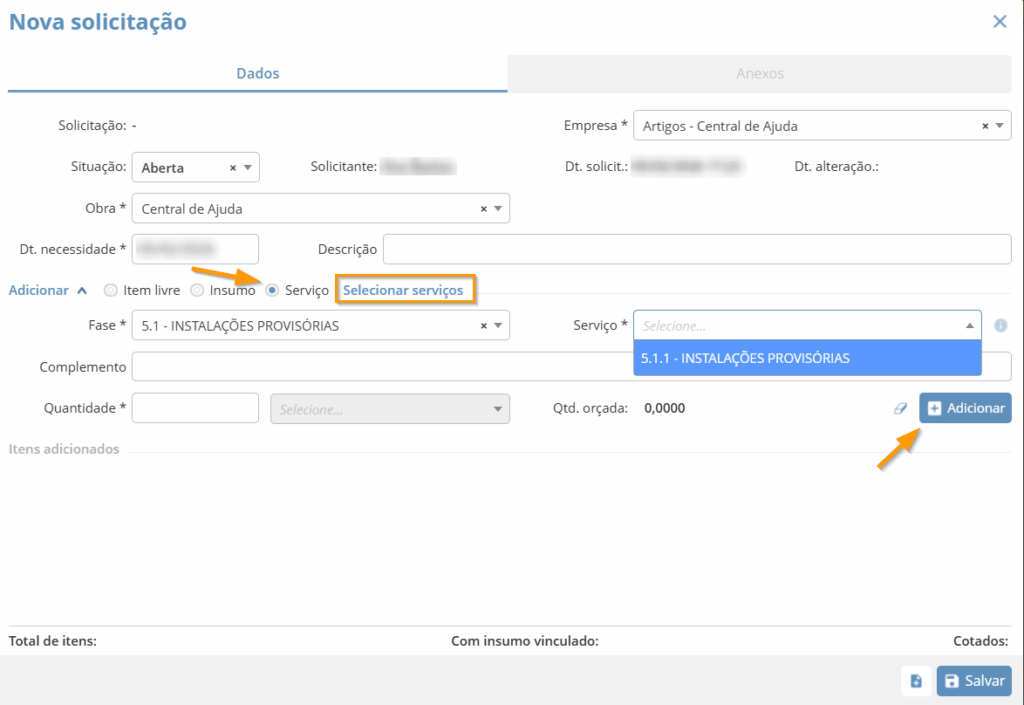Lembrando que para aparecerem as Fases e Serviços na solicitação, elas precisam estar cadastradas no orçamento da Obra.
