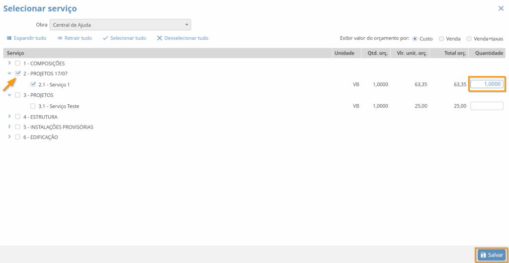 A solicitação do serviço é feita com base na fase de sua obra, por isso você precisar clicar em “Selecionar serviços“. O sistema então irá te mostrar as fases da obra, onde você poderá escolher os serviços que serão solicitados.