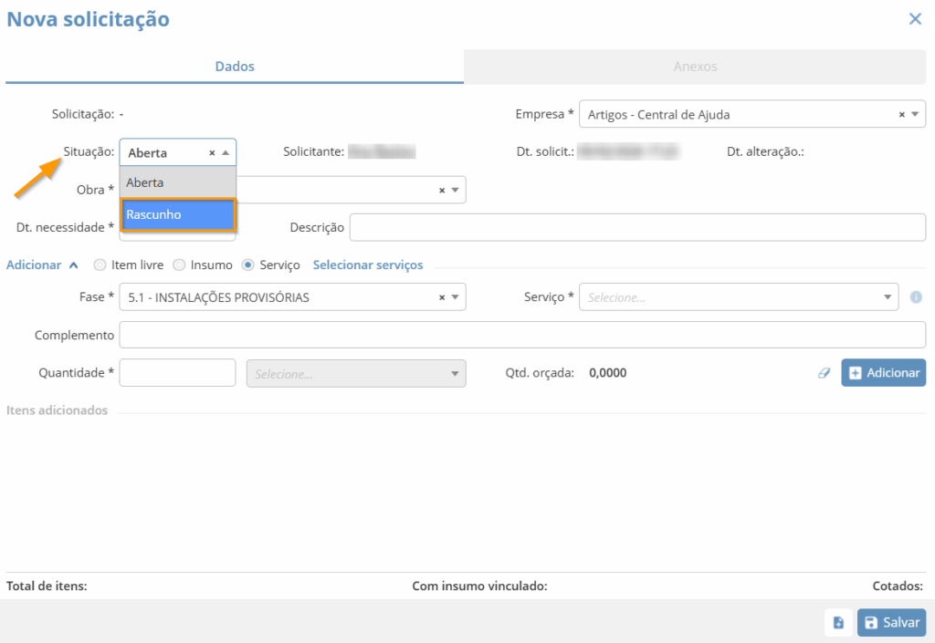 A opção Rascunho pode ser utilizada quando a solicitação ainda será editada ou criada em um segundo momento. Você poderá adicionar as informações e clicar em Salvar. Quando precisar solicitar, basta retornar e alterar a Situação para Aberta.