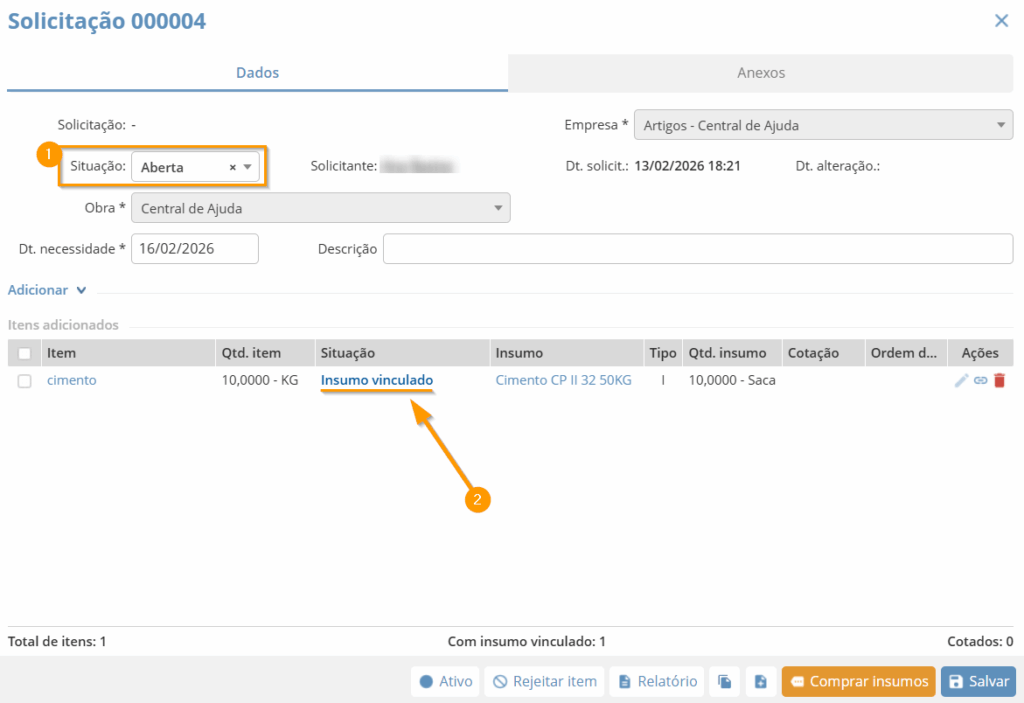 Primeiro acesse o módulo de “Compras” e busque por uma solicitação que já esteja aberta. Após localizar sua solicitação, verifique a situação e se os itens já possuem insumos vinculados.