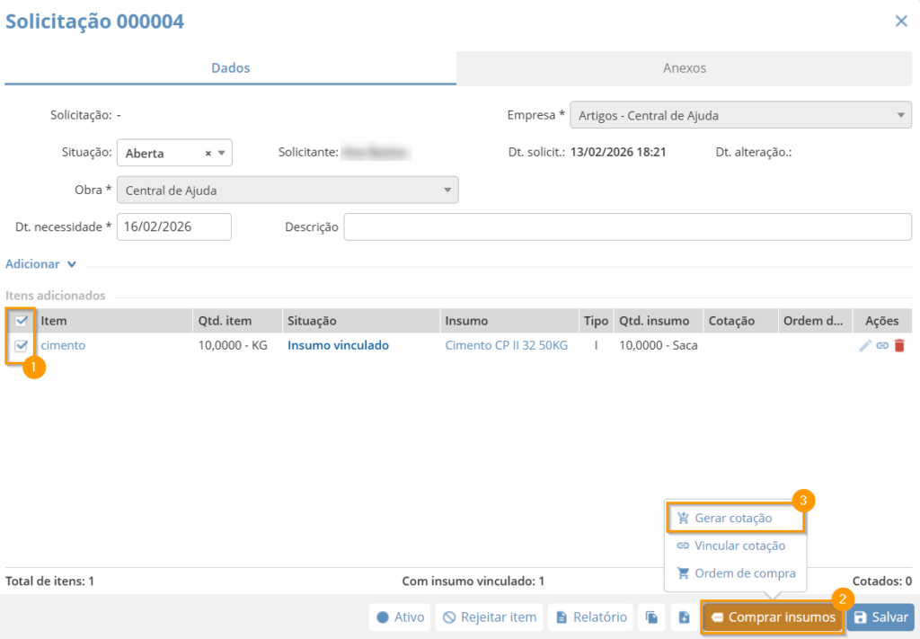 Após essas condições, selecione os itens que deseja levar para cotação na caixa de seleção. Com tudo selecionado, clique em “Comprar insumos” na barra inferior, e selecione a opção “Gerar cotação“.