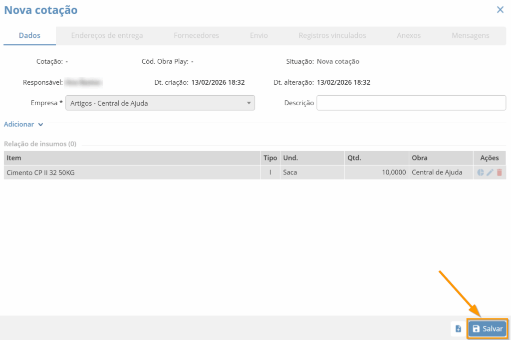 Após esse processo, abrirá uma nova tela com a cotação. Clique em “Salvar“.