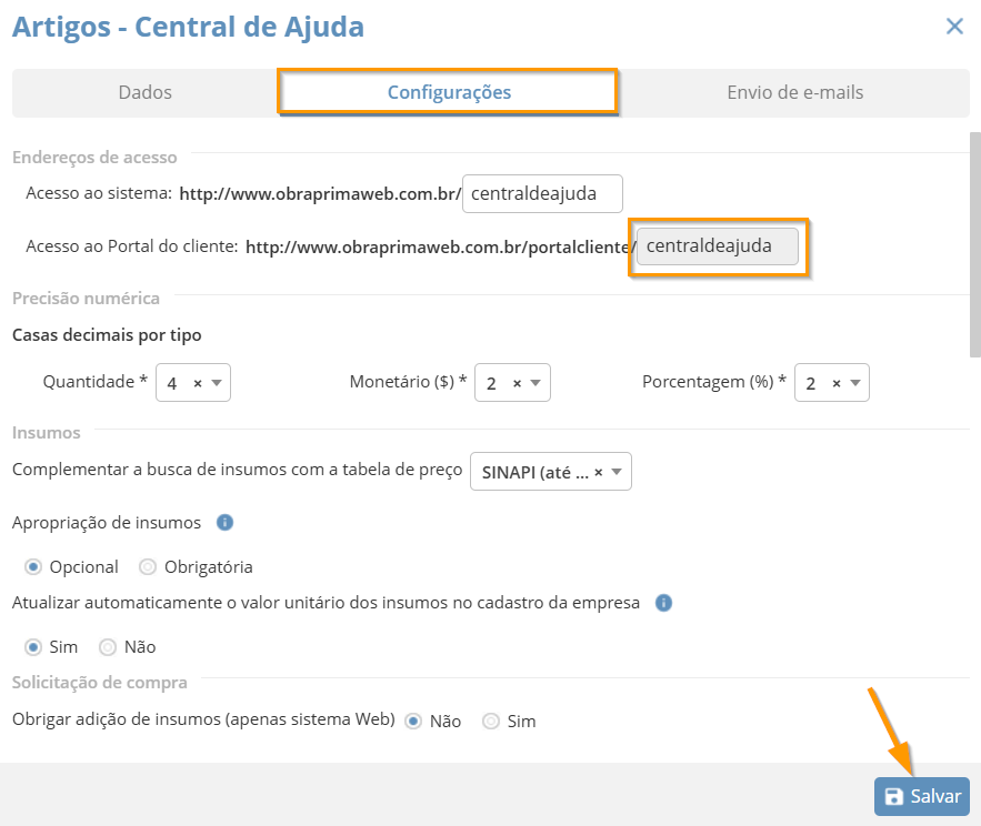 Caso, ao enviar os dados de acesso para o cliente, apareça a mensagem “Endereço para o Portal do cliente não cadastrado”, isso significa que o endereço ainda não foi configurado (conforme exemplo abaixo). Seguindo os passos descritos acima, você pode resolver esse problema rapidamente.
