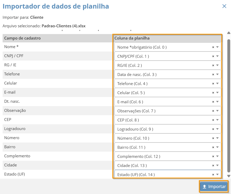 ⚠️ Importante: Hoje o sistema não exige uma planilha de importação padrão para Cliente (como Orçamentos), mas em anexo (no final do artigo) há um modelo que você pode utilizar para preenchimento;