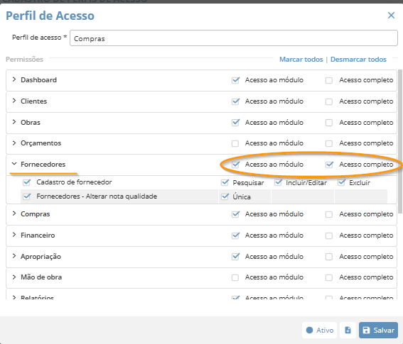 Acesso ao módulo: dá permissão para entrar e utilizar o módulo de Fornecedores com as permissões configuradas.