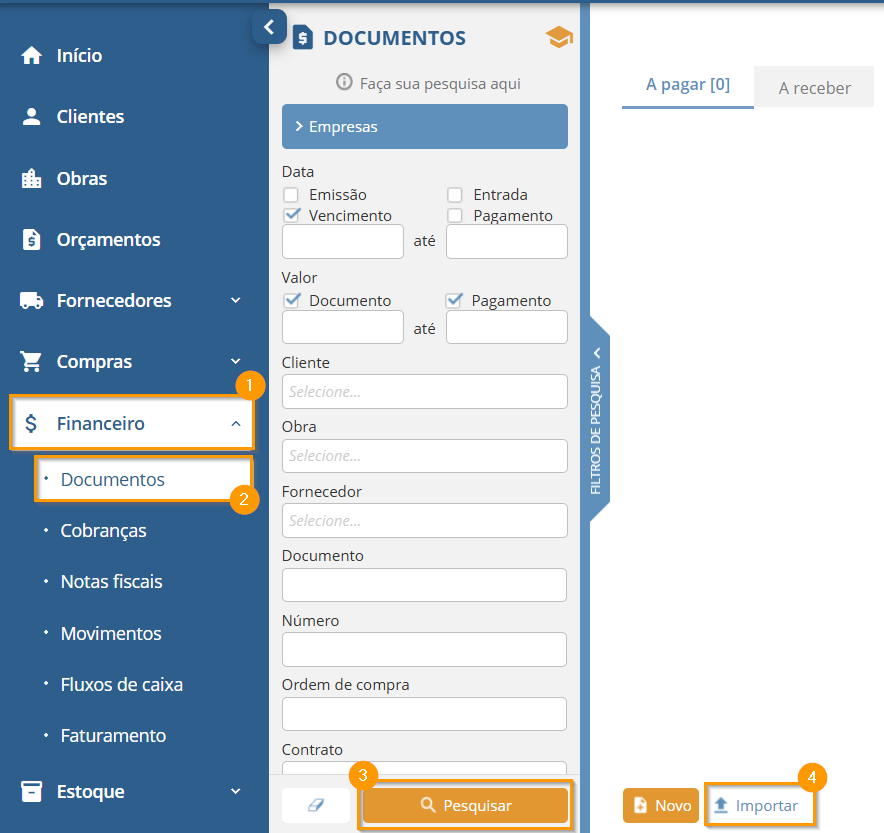 Acesse o “Financeiro”, clique em “Documentos”, em seguida clique no botão “Pesquisar”. No canto inferior, clique em “Importar”. Em vez de fazer o download da planilha, clique em ‘Avançar‘. Localize a planilha preenchida em seu computador e a carregue.