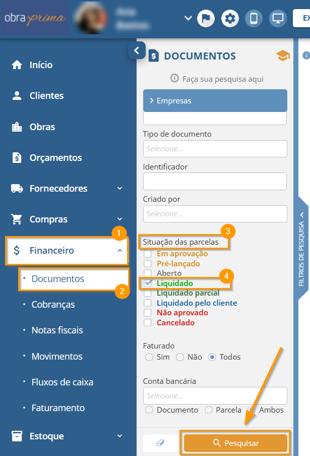 Acesse o módulo “Financeiro“ e clique em “Documentos“. Nos filtros laterais, procure o filtro de “Situação das parcelas” e selecione a situação “Liquidado” e clique em “Pesquisar“.