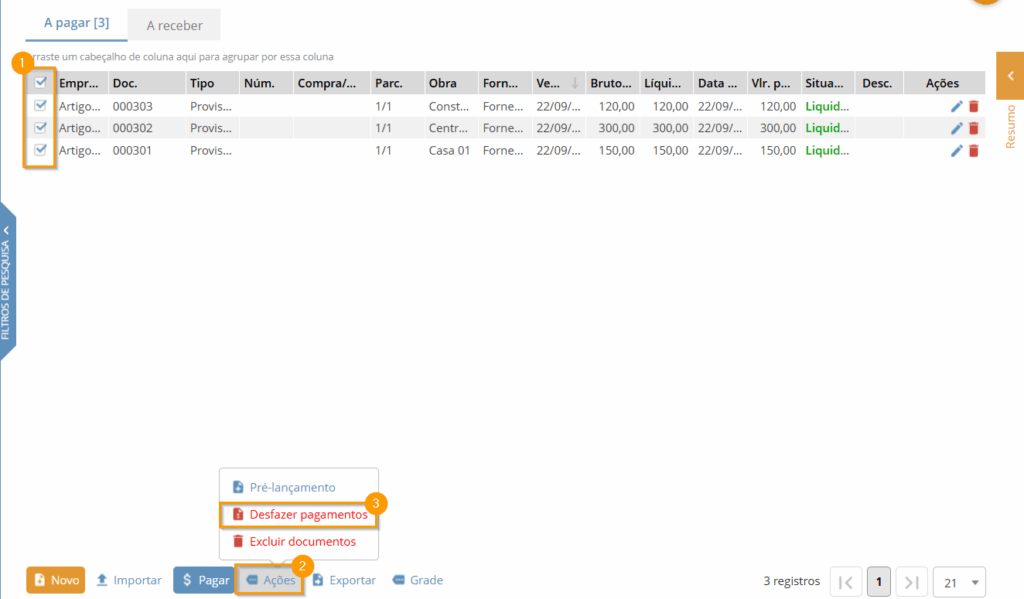 Lembre-se: não é possível desfazer pagamentos de forma massiva se os pagamentos foram feitos parcialmente, ou seja, se houver sub-parcelas.