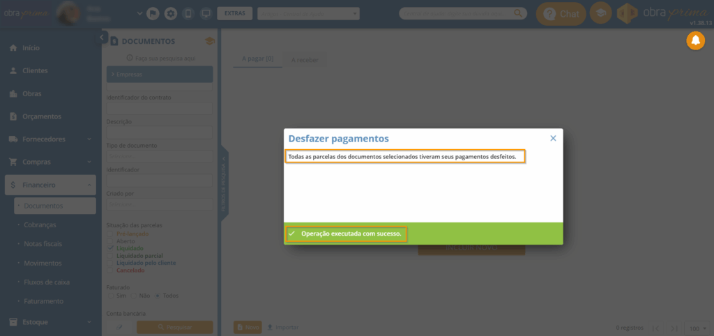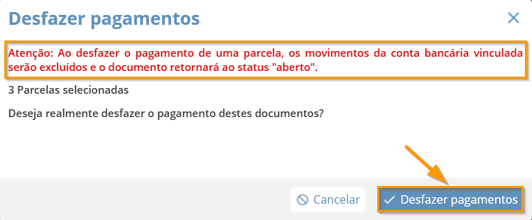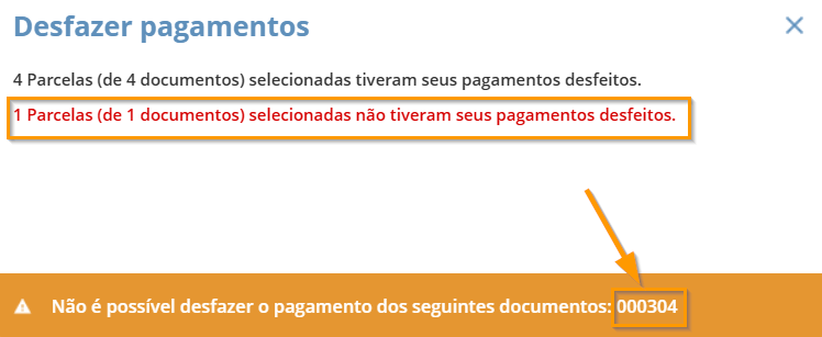 ⚠️Atenção: Se algum documento não tiver o pagamento desfeito, o sistema informará quantos foram desfeitos e quais documentos não tiveram pagamentos desfeitos e o número desse documento.