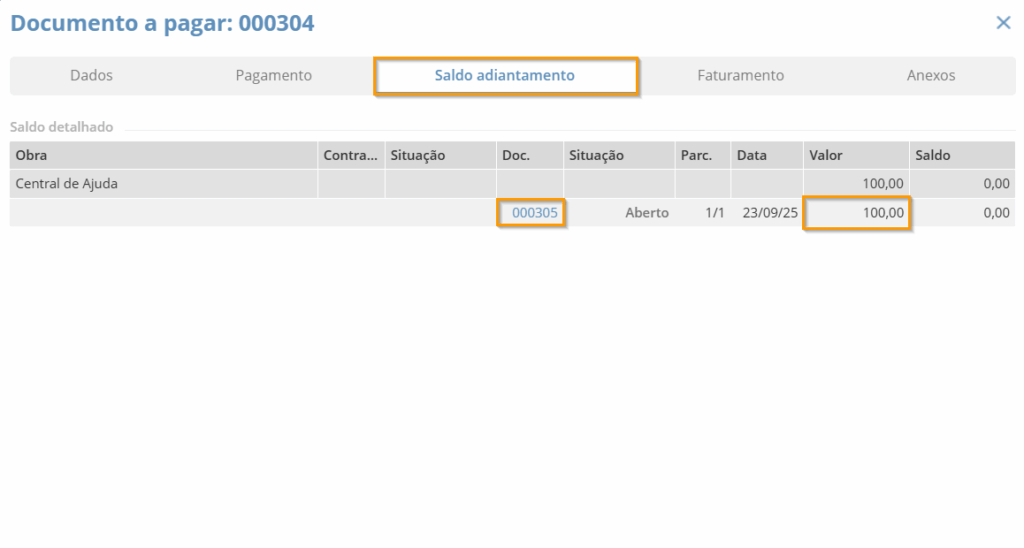 No exemplo mencionado acima, o sistema não excluiu um documento de Adiantamento de número 304, visto que ele está sendo usado como saldo em outro documento de número 305.