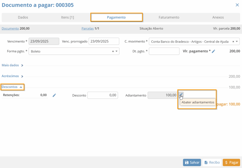 Para resolver essa situação, acesse o documento financeiro onde esse adiantamento está sendo utilizado, no exemplo acima, é o documento 305. Na aba de “Pagamento” vá até a seção “Descontos” e escolha a opção “Abater adiantamentos” clicando no ícone de lápis.