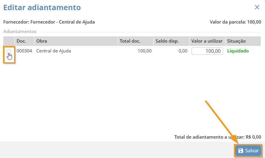 Ao editar o adiantamento, desmarque a opção marcada e clique em “Salvar” para retirá-lo como saldo do documento.