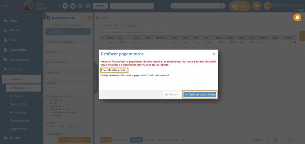 No sistema da Obra Prima, você pode desfazer pagamentos de maneira rápida e fácil, revertendo-os para a situação em “Aberto”.