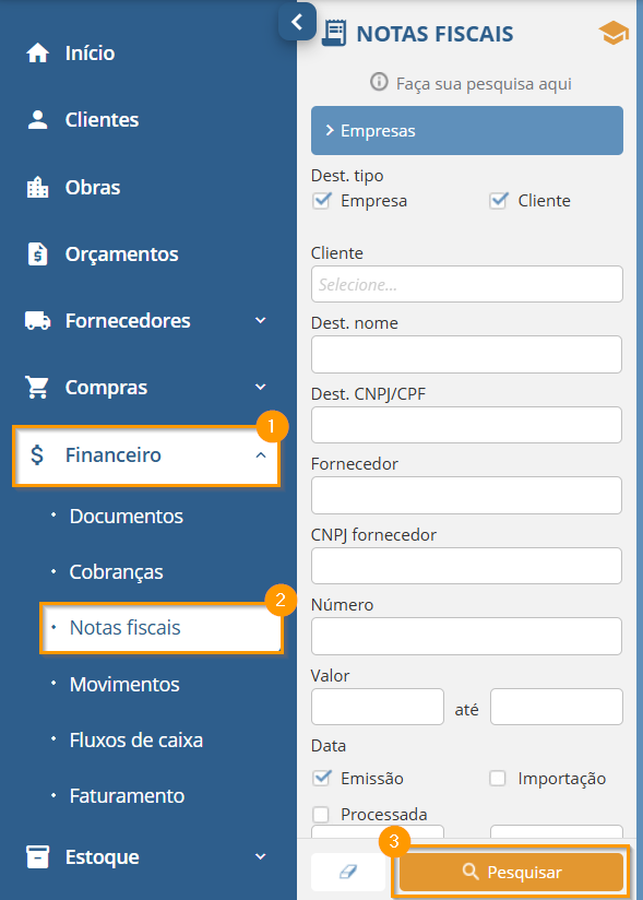 Acesse o menu Financeiro > Notas Fiscais > Pesquisar:
