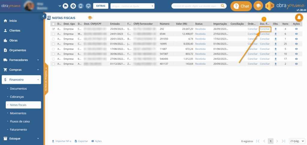 Na coluna “Doc. Financeiro”, clique em “Conciliar”: