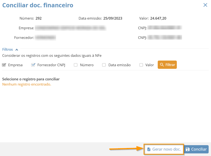Uma nova janela se abrirá, na qual você pode optar por conciliar pelo CNPJ do Fornecedor, Data de Emissão ou Valor: