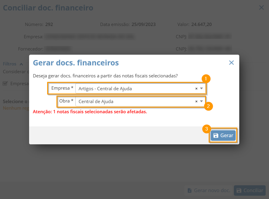 O sistema criará o documento financeiro com base nos dados da Nota Fiscal.