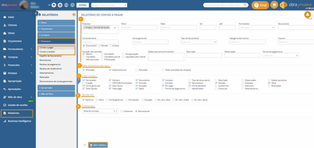 Para gerar o relatório, acesse o módulo “Relatórios” e, em seguida, vá para a seção “Financeiro” e escolha entre “Contas a pagar” ou “Contas a receber”. O sistema apresentará filtros divididos em cinco categorias: