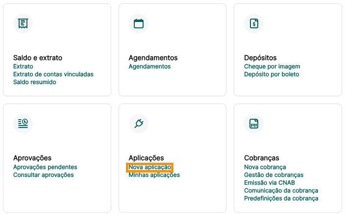 as opções Aplicações -> Nova aplicação. Importante: caso essas opções não estejam aparecendo, verifique se sua conta é apta a realizar a integração e/ou se está utilizando o usuário master.