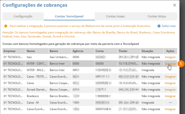 Clicando em Contas TecnoSpeed, você encontrará todas as contas que podem ser integradas ao Cobranças. Aqui, localize a conta referente ao Inter.