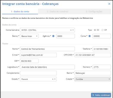 Ao clicar em “Integrar”, abrirá a tela com as informações da sua conta corrente. Essas informações são as mesmas que você encontra em Contas Bancárias, nas configurações do financeiro; Aqui, você poderá confirmar se as informações estão corretas ou corrigir, em caso de erro. Lembre-se que essas informações precisam estar exatamente como informado ao banco para que a integração ocorra.
