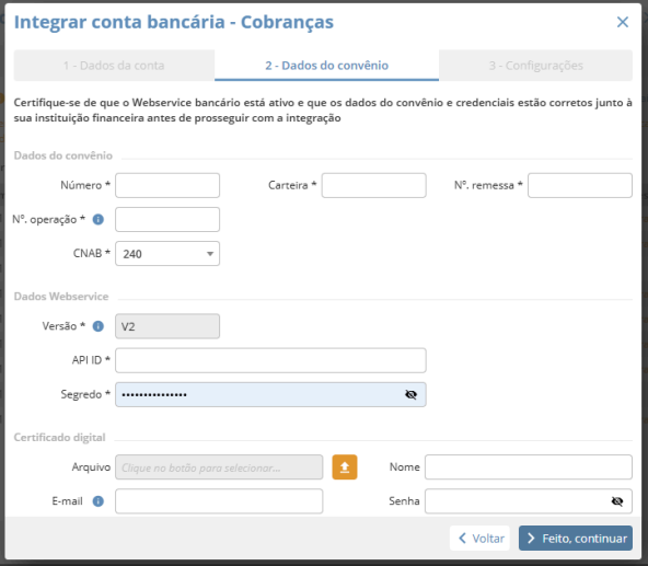Clicando em “Feito, continuar”, chegaremos a tela de integração. Aqui, os dados devem ser preenchidos com cuidado. Nessa etapa precisaremos das credenciais e do certificado que conseguimos nos passos acima.