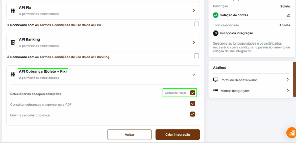 5º Passo: Ao avançar, é necessário escolher os serviços para integração. Aqui, é necessário selecionar API Cobranças (Boleto + Pix), que é o serviço necessário para a integração. Ao localizar, clique na seta para baixo e localize o “Selecionar todos” e selecione. Após isso, basta clicar em “Criar integração”.