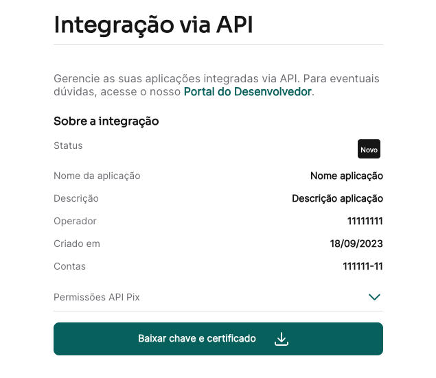 6º Passo: Ao clicar em “Criar integração”, teremos finalizado a liberação na sua conta corrente. Após a criação, você será direcionado à tela Gestão de Aplicações, onde sua aplicação será exibida com o Status “Novo”. Expanda os detalhes e você poderá ver mais informações sobre a aplicação, por exemplo, as permissões e contas correntes vinculadas. Nessa tela, você pode clicar em “Baixar chave e certificado”, eles serão utilizados para integrar no Obra Prima.