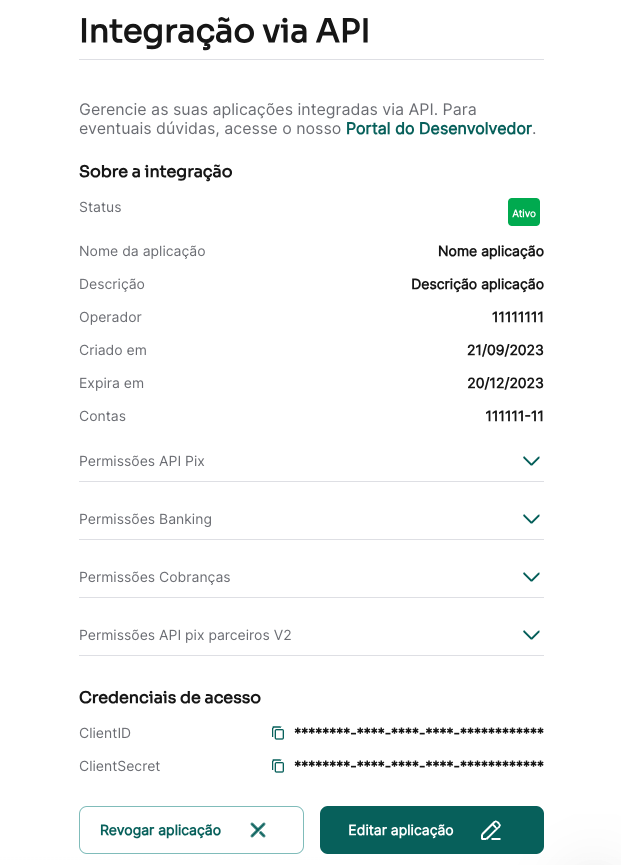 Ao baixar as chaves e o certificado, as credenciais serão geradas e exibidas na mesma tela de detalhes, enquanto a aplicação passará por um processo de validação. Após alguns minutos, o status será atualizado para Ativo e a aplicação estará pronta para utilização.